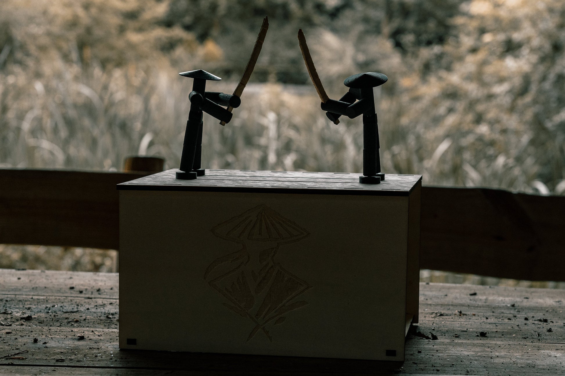 The table maintains a pure, minimal form, reminiscent of a ceremonial tatami space. The warriors, cords and magnetic hats preserve the classic gameplay, while the visual and tactile expression of the set transforms it into a functional work of art.