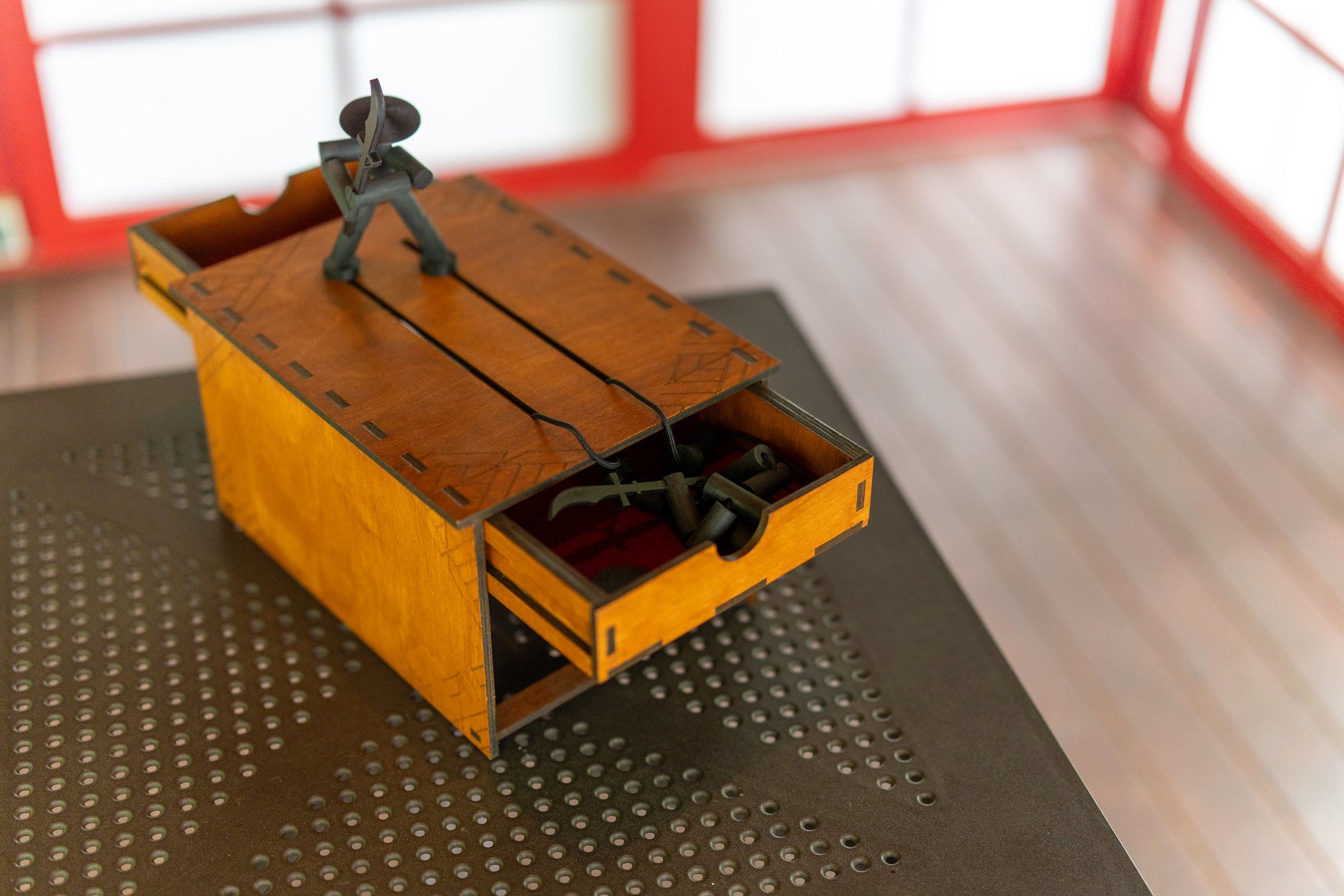At the heart of the game lies a solid, handcrafted wooden table, enhanced with discreet drawers on both sides to store your marionette warriors. Anti-slip pads ensure stability during intense duels, while every detail has been elevated for both functionality and beauty.